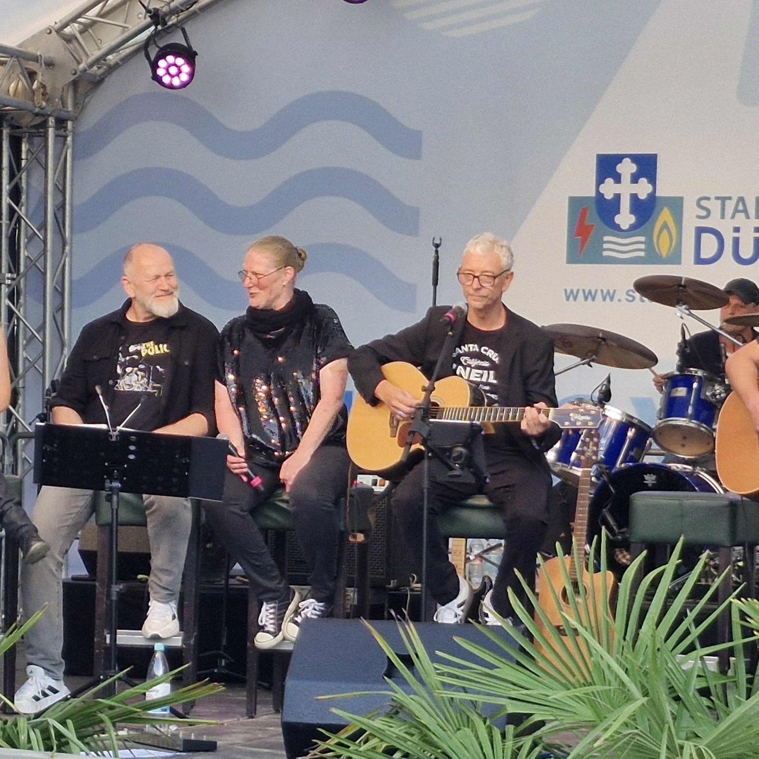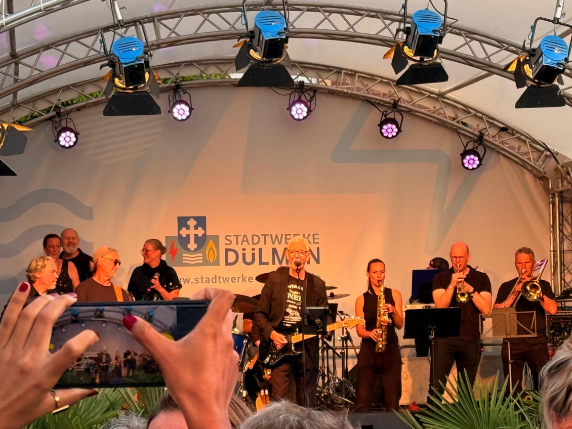 Was für ein Abend … Alle sind sie gekommen an diesem 11. Juli 2025 auf den Dülmener Marktplatz. Roland Osterkamp, Melanie Cloidt, die Brass-Section, HG und und und … Jan Dirk Püttmann (damals Bürgermeister) ist sogar gekommen, um uns anzusagen. Auf der Bühne (aber auch backstage) hatten wir viel Spaß.
